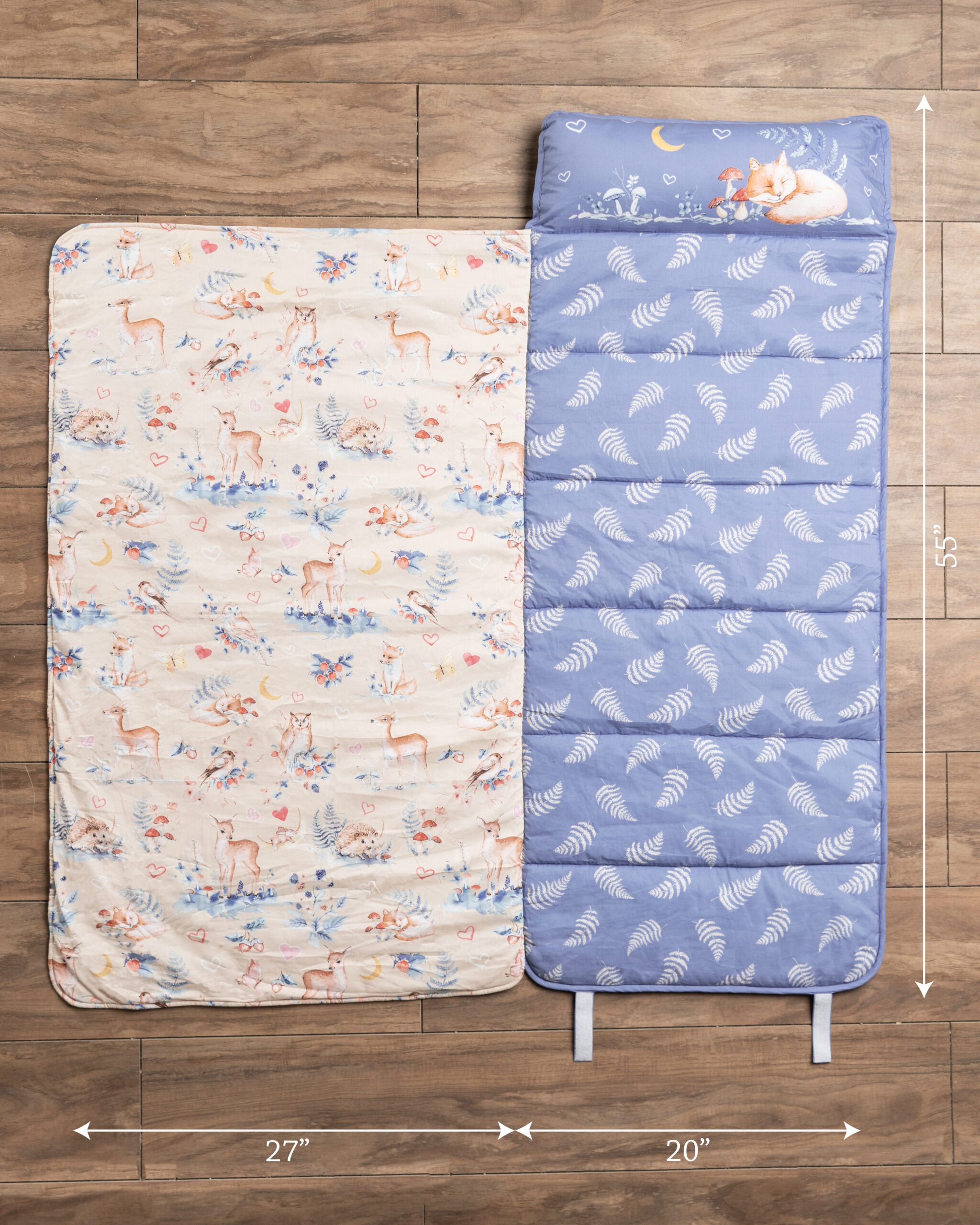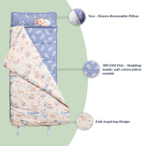 • The Perfect Size: Generous in size, Napmat measures 55” in length, 20” in bed width, 27” in blanket width, and 1.5” in height, providing ample space for your child to snuggle in wherever they are. Napmat is crafted to provide utmost comfort, with 300 GSM poly wadding for the bed, 200 GSM for the blanket, and 180 grams of filling in the pillowcase.