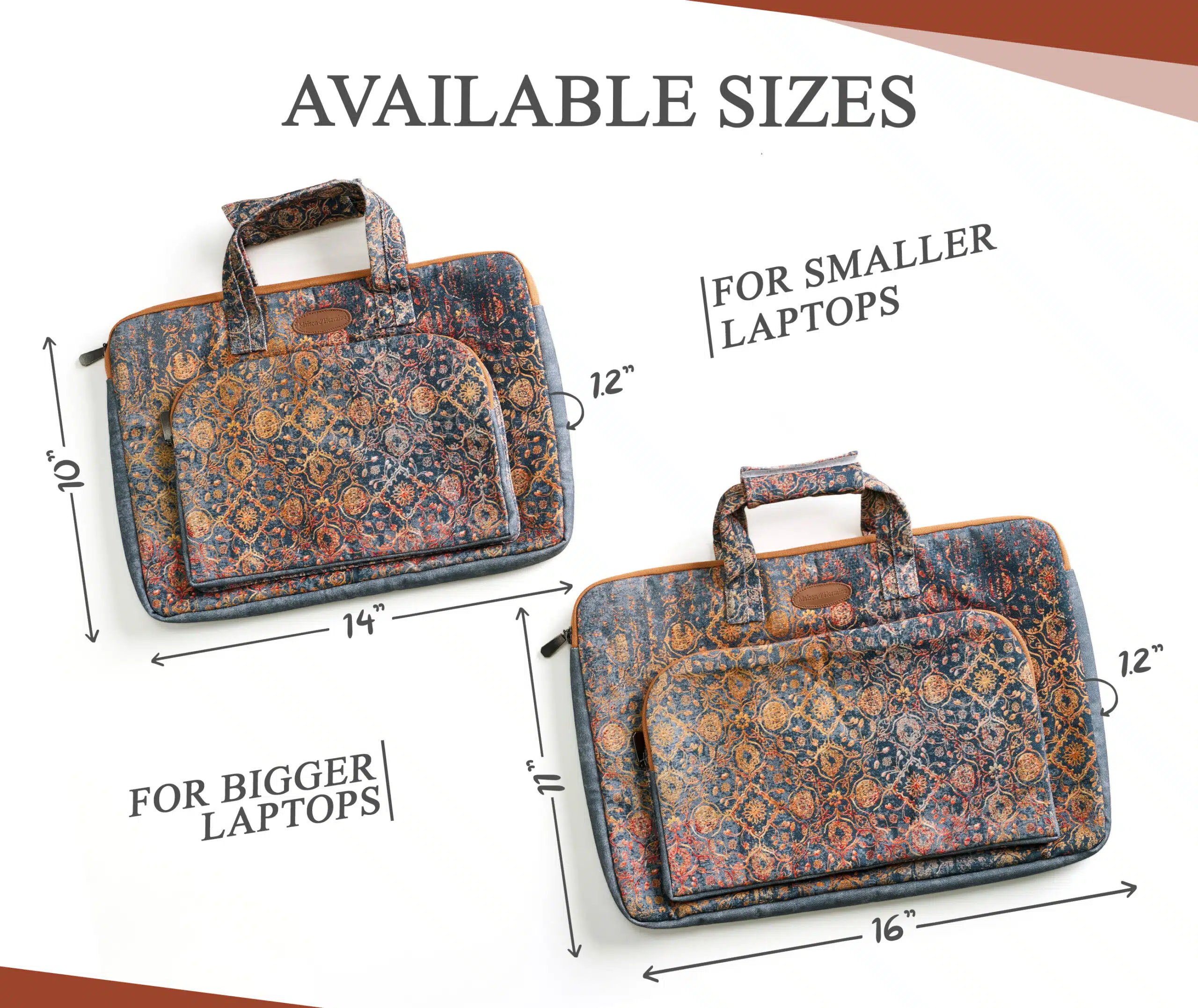 • Sizes: Comes in two sizes o Small – 14” Width, 10” Length, 1.2” Deep (Outer dimension) Compatible with 12”-13.3” Laptops / Ultrabooks, 13-13.5” Laptops / Notebooks / Ultabooks. o Large – 16” Width, 11” Length, 1.2” Deep (Outer dimension) Compatible with 15” Macbook air / Macbook pro, 15.3” ipad pro and most 14-14.56” Laptops / Notebooks / Ultrabooks.