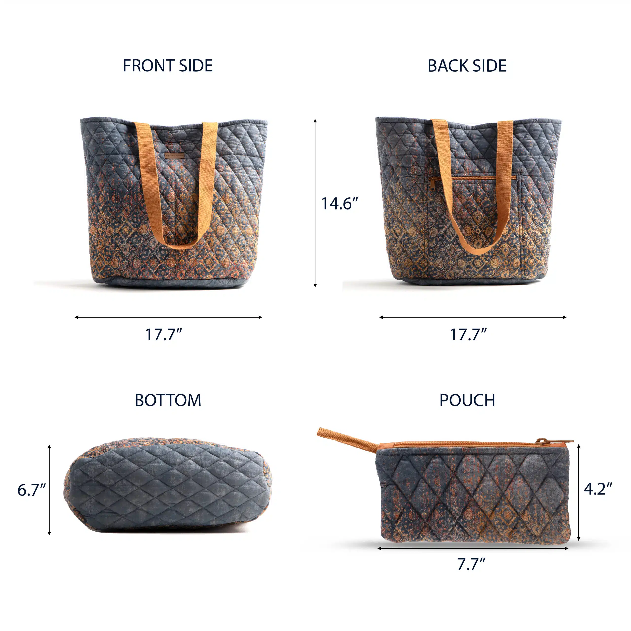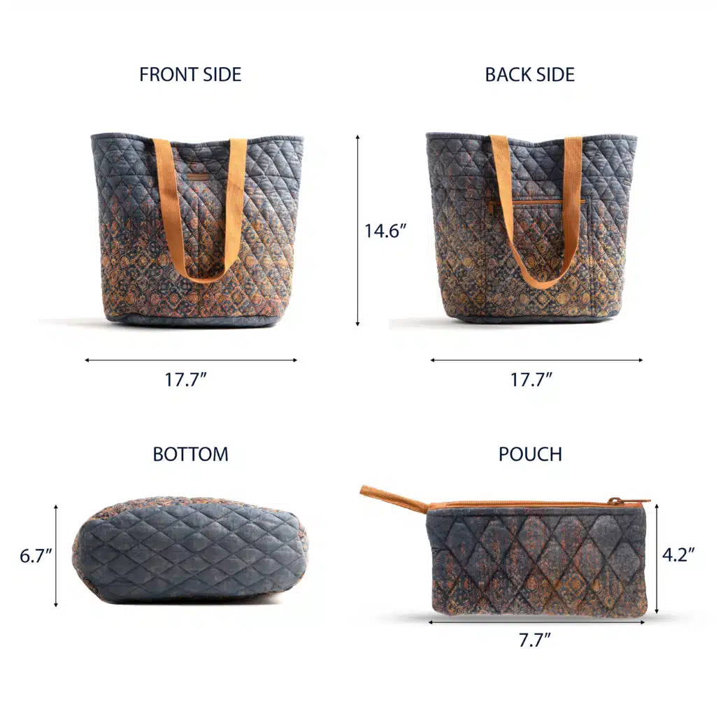 • Package Includes: 1 shopping bag with small pouch made of 100% cotton measures Length – 17.7 Inch Height – 14.6 Inch, Width – 6.7 Inch and pouch measure Length – 7.7 Inch, Height – 4.2 Inch.