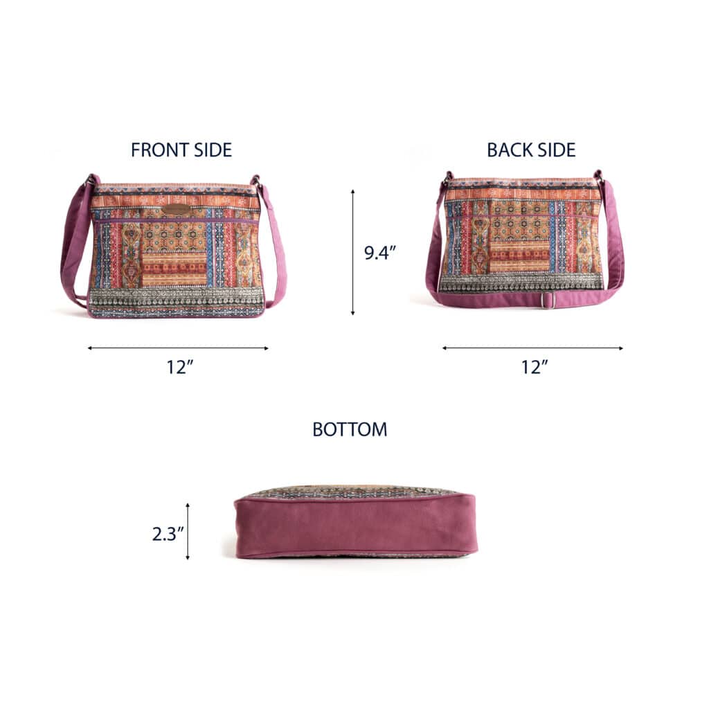 • Package Includes: 1 cross body bag made of 100% cotton measures Length – 12 Inch Height – 9.4 Inch, Width – 2.3 Inch.