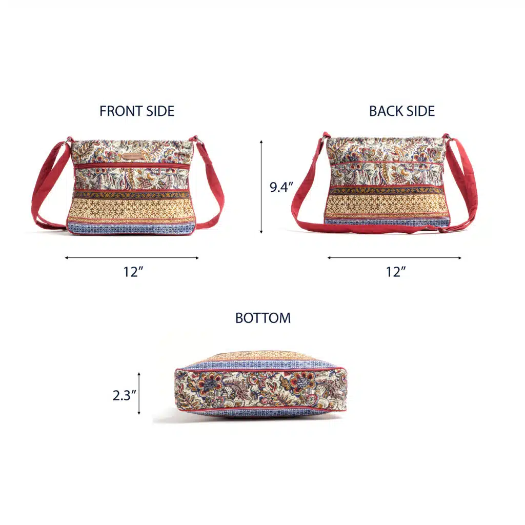 • Package Includes: 1 cross body bag made of 100% cotton measures Length – 12 Inch Height – 9.4 Inch, Width – 2.3 Inch.