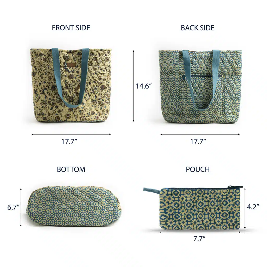 • Package Includes: 1 shopping bag with small pouch made of 100% cotton measures Length – 17.7 Inch Height – 14.6 Inch, Width – 6.7 Inch and pouch measure Length – 7.7 Inch, Height – 4.2 Inch.