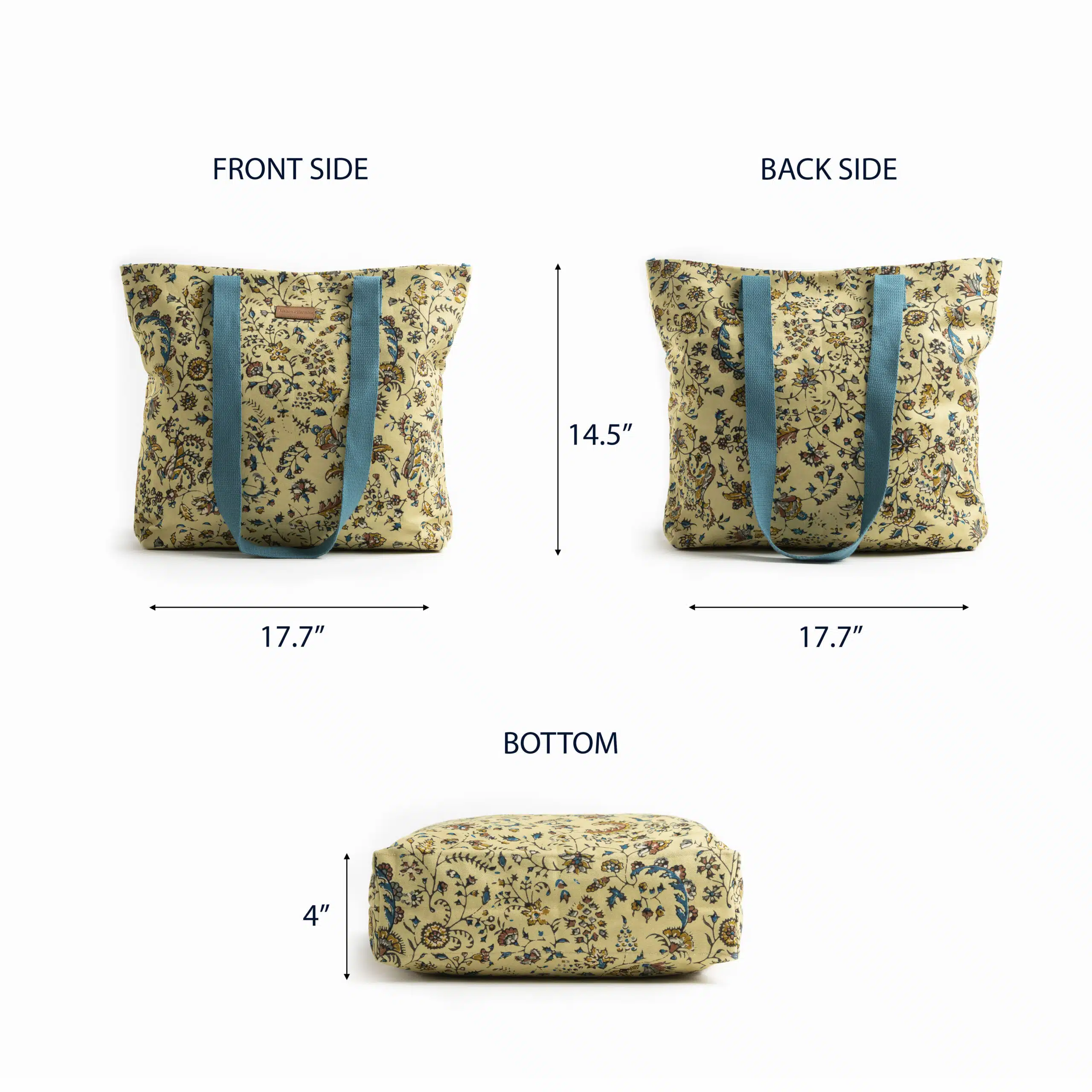 • Package Includes: 1 canvas tote bag made of 100% cotton measures Length – 17.7 Inch Height – 14.5 Inch, Width – 4 Inch.