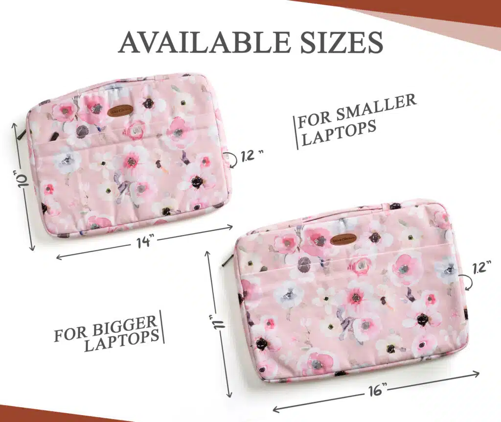 • Sizes: Comes in two sizes o Small – 14” Width, 10” Length, 1.2” Deep (Outer dimension) Compatible with 12”-13.3” Laptops / Ultrabooks, 13-13.5” Laptops / Notebooks / Ultabooks. o Large – 16” Width, 11” Length, 1.2” Deep (Outer dimension) Compatible with 15” Macbook air / Macbook pro, 15.3” ipad pro and most 14-14.56” Laptops / Notebooks / Ultrabooks.