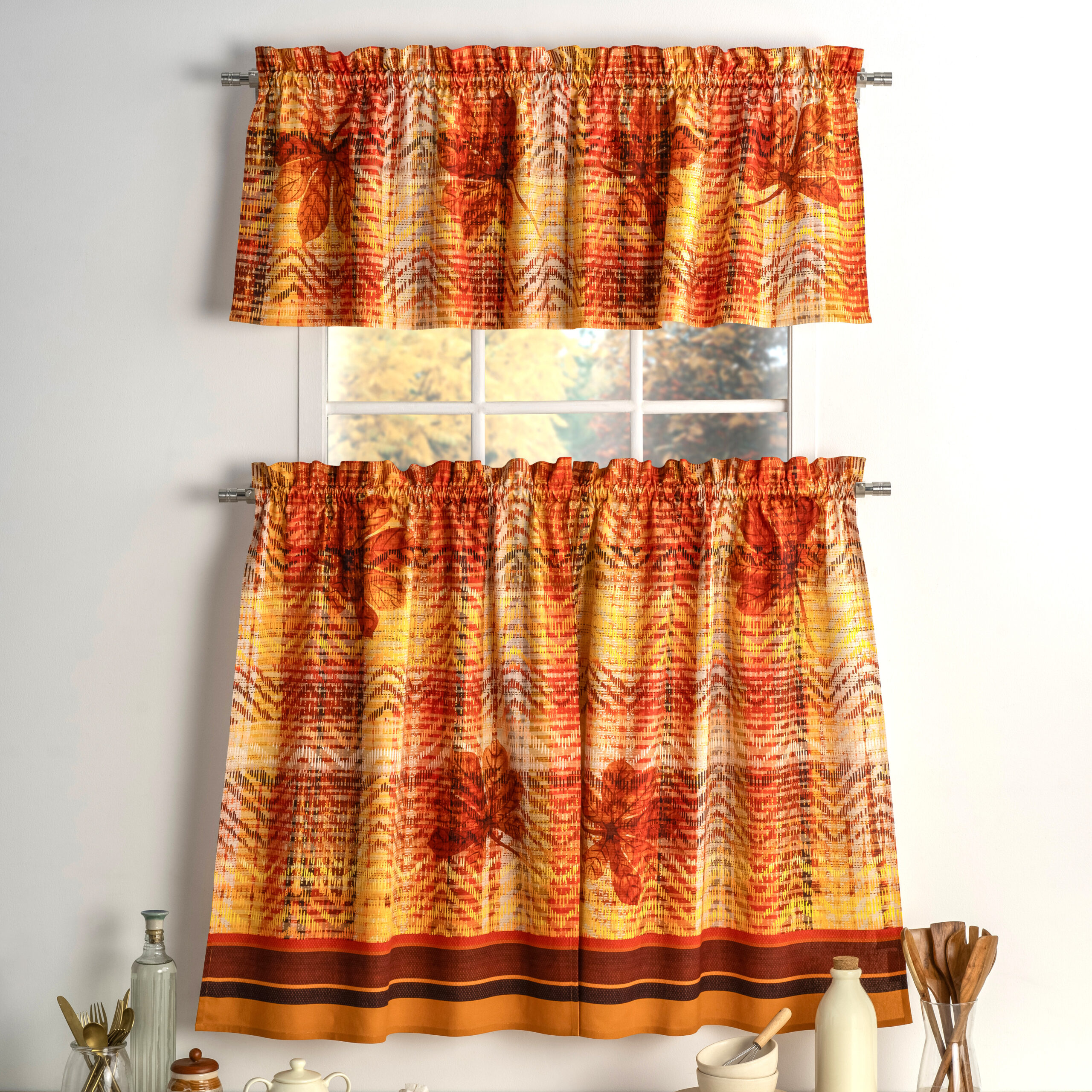 • Package Includes: 2 Tiers (28″x36″) and 1 Valance (56″x18″). Our Kitchen Curtain set brings style to your home that will add a touch of elegance at the same time being practical. Our products are Designed in Europe and Made in India.