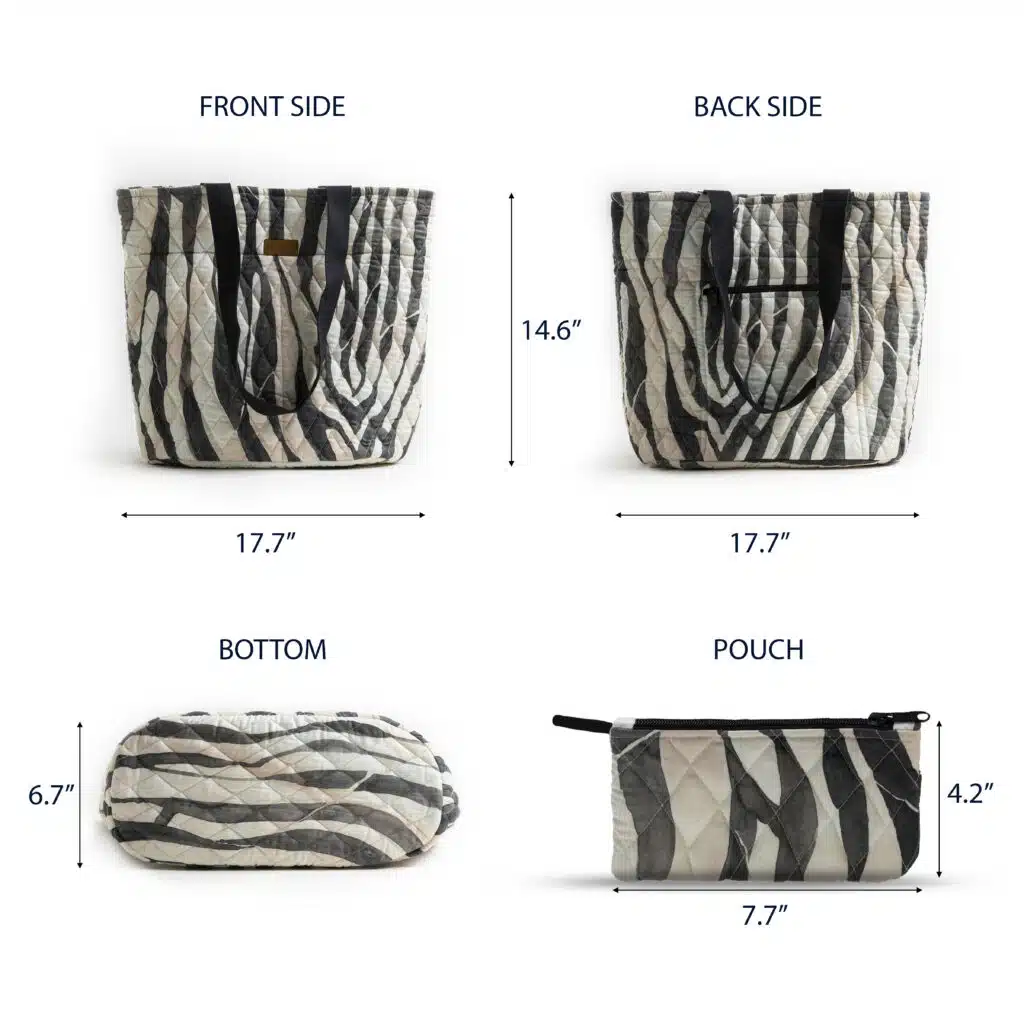 • Package Includes: 1 shopping bag with small pouch made of 100% cotton measures Length – 17.7 Inch Height – 14.6 Inch, Width – 6.7 Inch and pouch measure Length – 7.7 Inch, Height – 4.2 Inch.
